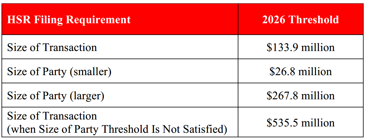 - The 2026 adjusted HSR threshold will increase to $133.9 million. All transactions valued below that amount will be exempt from the HSR filing requirement.