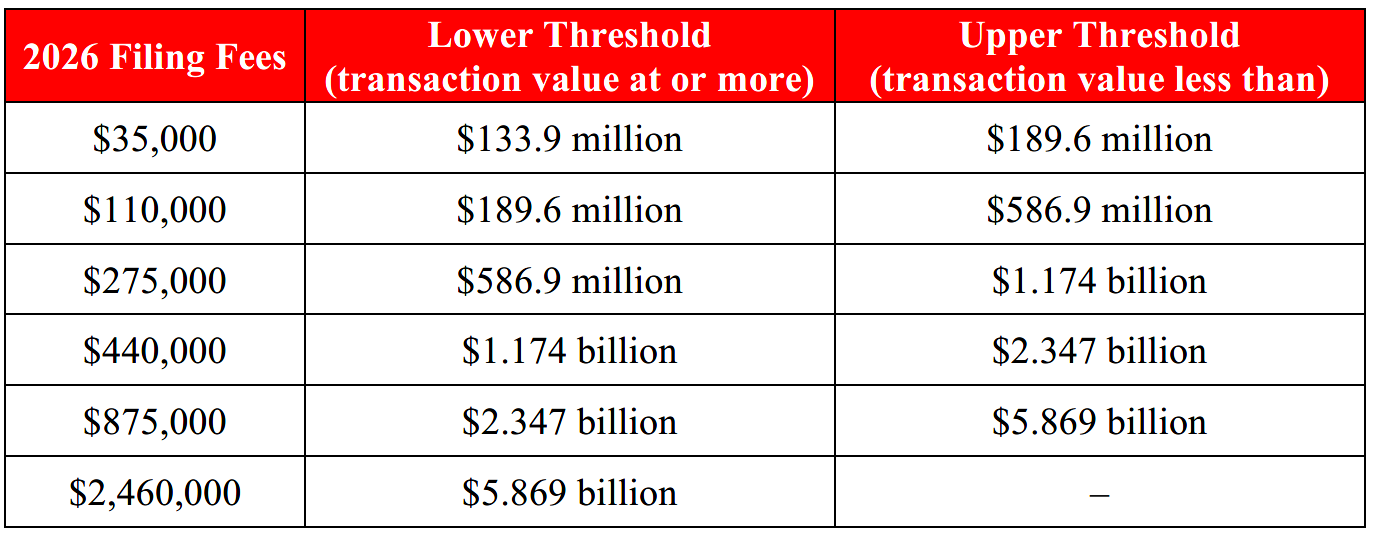 The FTC also revised the HSR filing fee schedule based on changes to the U.S. gross national product and the consumer price index. The 2026 filing fee schedule is follows: