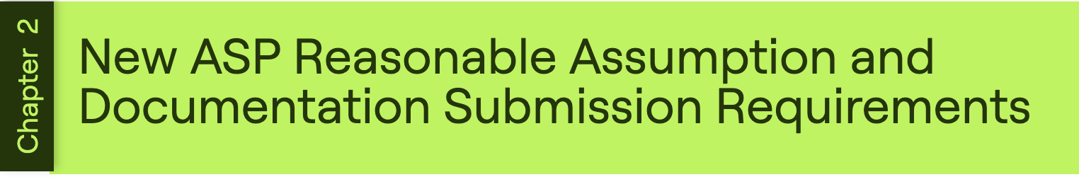 - Reasonable assumptions submissions, including documentation of the FMV analysis for BFSFs: The reasonable assumptions in support of ASP would also need to “includ[e] documentation of the methodology used to determine fair market value [(FMV)] and periodic reviews of fair market value.”