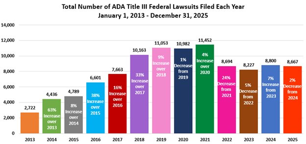[Total Number of ADA Title III Federal Lawsuits Filed Each Year, January 1, 2013 – December 31, 2025; 2013: 2,722; 2014: 4,436 – 63% increase over 2013; 2015: 4,789 – 8% increase over 2014; 2016: 6,601 – 38% increase over 2015; 2017: 7,663 – 16% increase over 2016; 2018: 10,163 – 33% increase over 2017; 2019: 11,053 – 9% increase over 2018; 2020: 10,982 – 1% decrease from 2019; 2021: 11,452 – 4% increase over 2020; 2022: 8,694 – 24% decrease from 2021; 2023: 8,227 – 5% decrease from 2022; 2024: 8,800 – 7% increase over 2023; 2025: 8,667 – 2% decrease from 2024]