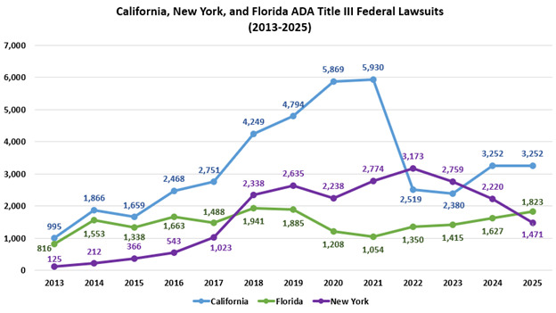 [California, New York, Florida ADA Tile III Federal Lawsuits 2013-2025: California: 2013: 995; 2014 1,866; 2015: 1,659; 2016: 2,458; 2017: 2,751; 2018: 4,249; 2019: 4,794; 2020: 5,869; 2021: 5,930; 2022: 2,519; 2023: 2,380; 2024: 3,252; 2025: 3,252; Florida: 2013: 816; 2014: 1,553; 2015: 1,338; 2016:1,663; 2017: 1,488; 2018: 1,941; 2019: 1,885; 2020: 1,208; 2021: 1,054; 2022: 1,350; 2023: 1,415; 2024: 1,627; 2025: 1,823; New York: 2013: 125; 2014: 212; 2015: 366; 2016: 543; 2017: 1,023; 2018: 2,338; 2019: 2,635; 2020: 2,238; 2021: 2,774; 2022: 3,173; 2023: 2,759; 2024: 2,220; 2025: 1,471]