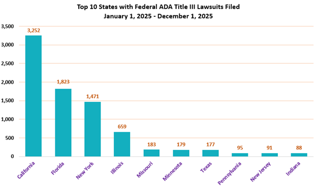 [Top 10 States with Federal ADA Title III Lawsuits Filed January 1, 2025 – December 31, 2025: California: 3,252; Florida: 1,823; New York: 1,471; Illinois: 659; Missouri: 183; Minnesota: 179; Texas: 177; Pennsylvania: 95; New Jersey: 91; Indiana: 88]