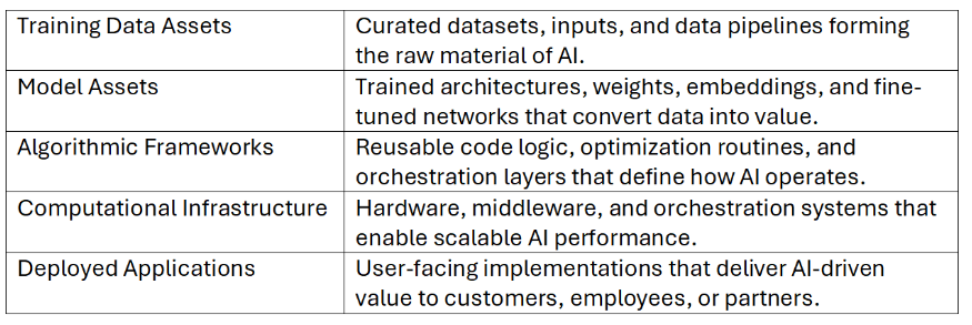 AI assets can be grouped into five primary categories: Training Data, Model Assets, Algorithmic Frameworks, Computational Infrastructure, and Deployed Applications. In the following sections, we explain how to recognize the asset, protect it under appropriate IP strategies, and extract measurable economic returns. We conclude by positioning AI as a new form of enterprise capital—an identifiable, controllable, and monetizable intangible asset that should be listed on balance sheets—and by providing SME executives with a “how-to” manual for converting AI innovation into defensible value and investor confidence.
