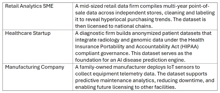 Model Assets include trained neural networks, embeddings, weights, and architectures that apply data to provide actionable insight.8 They embody both creative design and empirical learning, representing a hybrid of software and proprietary know-how. For some SMEs, these assets can represent high revenue potential through licensing opportunities, SaaS platforming, and embedded analytics for client products.