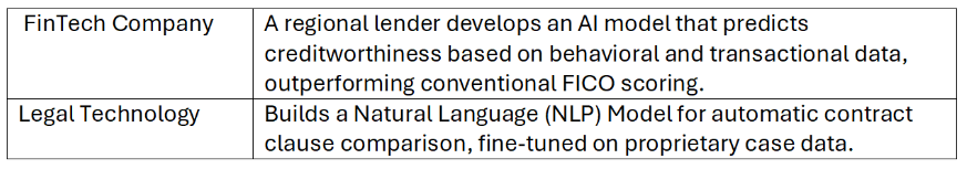 Examples of Deployed Applications can include conversational bots, predictive dashboards, generative design tools, and embedded AI modules. These products embody not just code but also brand identity, user experience, and data-driven differentiation. Therefore, Deployed Applications can often meet all IP protections tests and be commercially licensed.