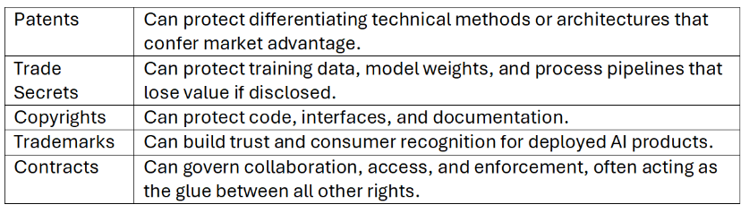 Understanding this hierarchy of assets can help SMEs map each technical component to specific IP protections. For example, copyright for code, patents for innovations, trade secrets for proprietary processes, trademarks for deployed products, and contracts for legal enforcement. The following sections describe each primary AI asset category in detail and with examples, supporting relationships, and recommended protection strategies.
