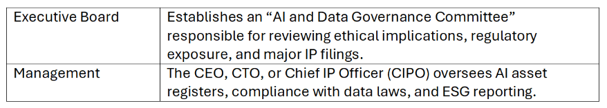 - Establish an AI oversight committee or designate a responsible executive.