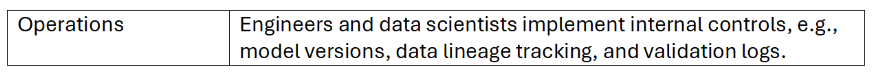 Governance structures do not need to be complex. Developing a hierarchy of responsibilities—Board Oversight, Executive Management, and Technical Stewardship—should be sufficient and scalable for most SMEs. The board sets AI policies and risk tolerance; executives allocate resources and ensure compliance; and technical leaders monitor performance, bias, and data integrity. These three aspects of AI leadership within a firm can ensure accountability without excessive bureaucracy or overhead costs.