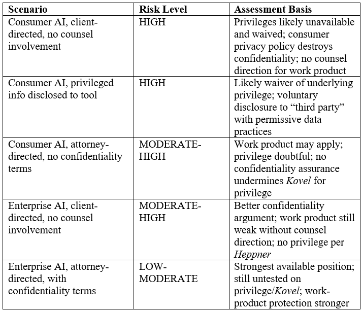 - Explicit client counseling about the risks of independent AI use, including the risk of destroying privilege and work-product protection.