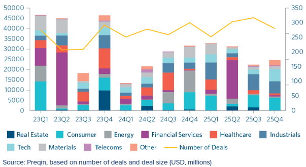 Private credit attracted a lot of global attention in 2025, and fundraising for Asia private credit funds outperformed 2024 significantly, with thanks to an uptick in Q4 fundraising due to US$5.6 billion and US$2.79 billion raises late in the quarter. That said, there has been no explosion in fundraising either, and the 2025 total sits between the heights of 2022 and the depths of 2024.