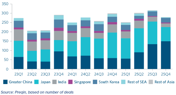 Throughout 2025, both the Chinese and the Japanese markets attracted mainly domestic capital, with international investors interested mostly in Southeast Asia and India (regions that arguably have limited domestic capital to deploy).
