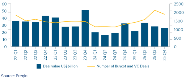 However, with lower valuations, the IPO exit markets in Hong Kong and mainland China were resurgent and, with policies announced to increase domestic consumption, we see opportunities for China deployment continuing to grow in 2026.