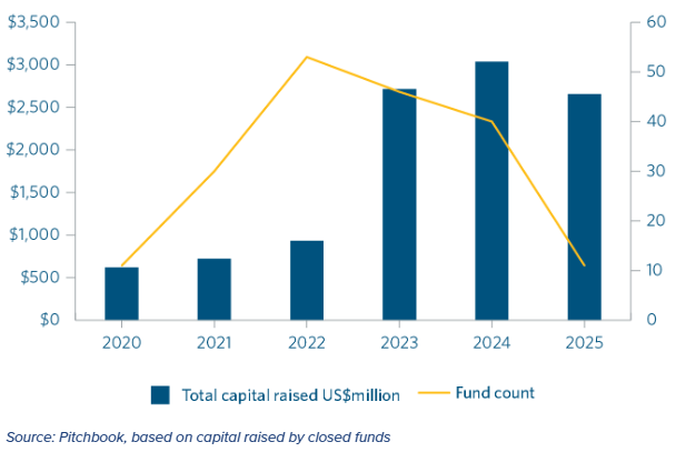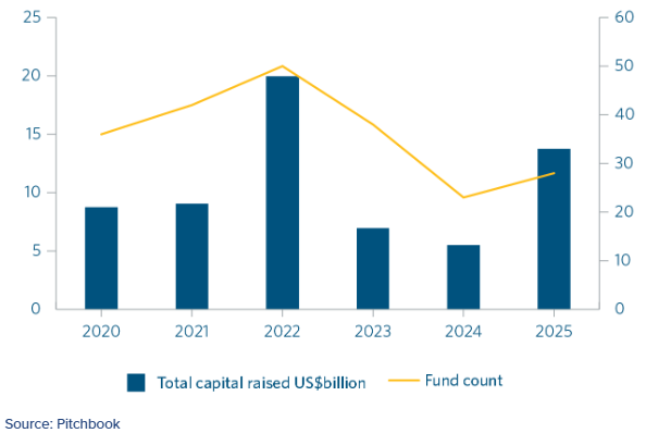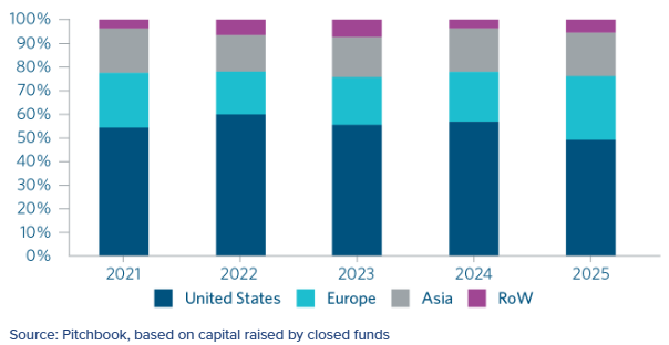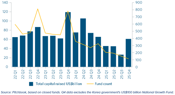 We believe that Asia’s subdued 2025 fundraising environment was caused mainly by a lack of exits and therefore distributions to LPs, weakness in the Chinese growth and PE market, and a lack of interest in Asia by international investors exacerbated by geopolitical factors (including the US outbound investment restrictions aimed at the Chinese technology sector).