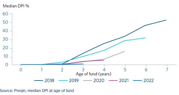 The following graphs illustrate the liquidity problem that plagued private capital markets in 2025. According to Preqin data, median DPI is lower for later vintages.