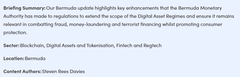 The BMA has continued to enhance and update applicable rules, regulations, codes of practice, statements of principles, and guidance to extend the scope of both Digital Asset Regimes and ensure it remains relevant and innovative in combatting fraud, money-laundering, terrorist financing and promotion of consumer protection.