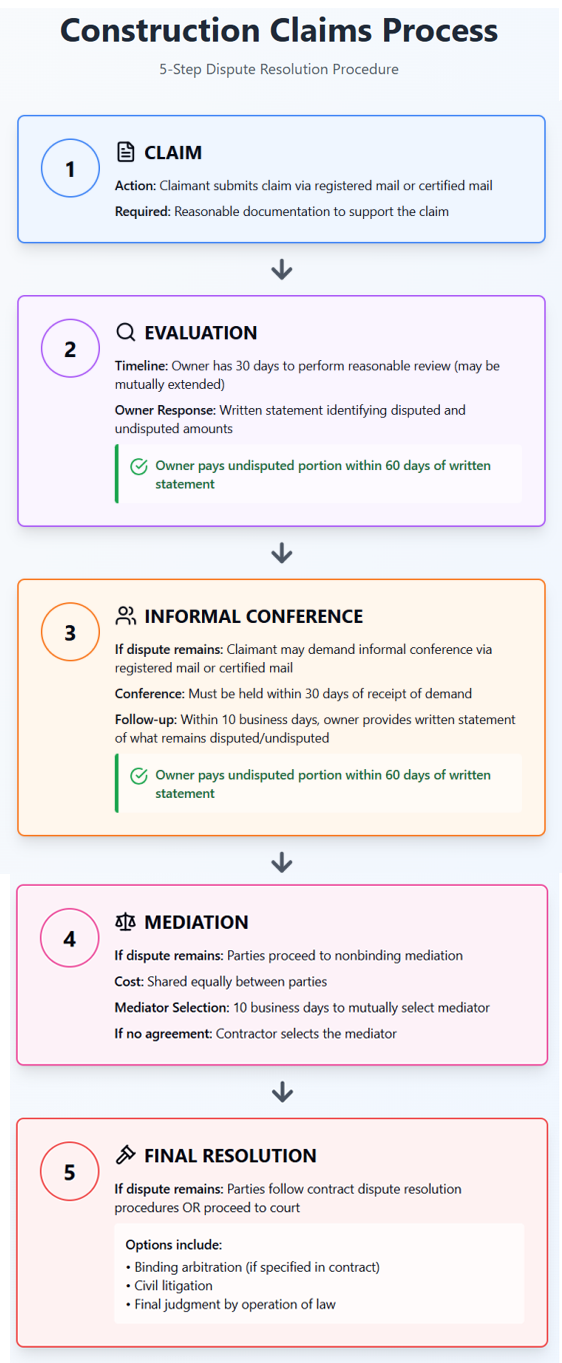 This new law establishes a process to resolve change order and other payment disputes for private works contracts entered into on or after January 1, 2026. The new law will sunset on January 1, 2030, unless extended.