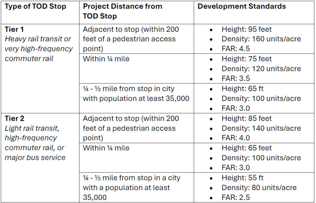 SB 79 limits a local agency’s ability to restrict certain development standards for transit-oriented housing developments. It also distinguishes between types of TOD stops based on the type of transit that serves the stop.