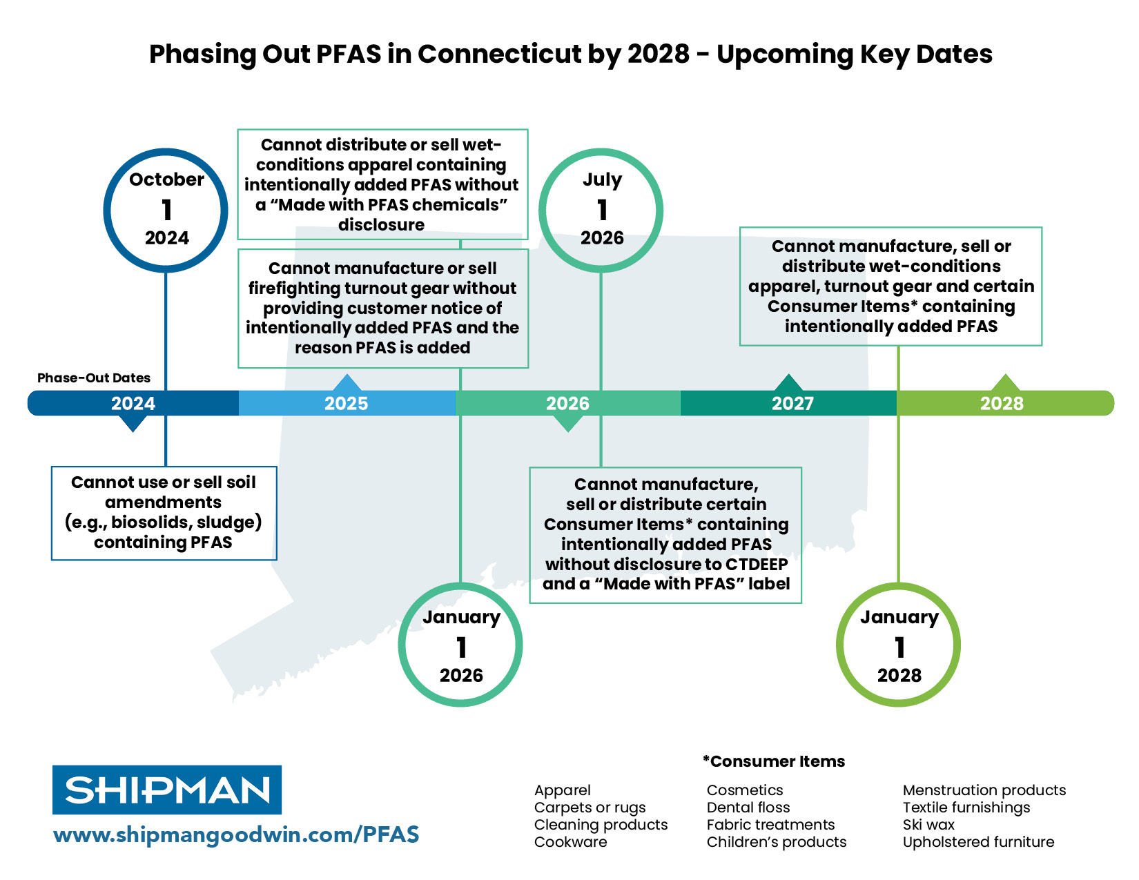 As noted, the 2024 law also established a full phase-out date for intentionally added PFAS in the consumer product categories listed above, as well as wet conditions apparel and firefighter turnout gear, regardless of labeling, notice or disclosure compliance. Affected parties must make the necessary adjustments to eliminate PFAS from these products by the January 1, 2028 deadline to continue sales and distribution in Connecticut.