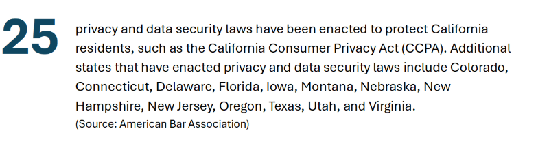 An organization’s data is one of its most valuable assets, yet it is one of its most vulnerable. The growing prevalence of AI across industries has introduced new litigation risks and compliance demands, requiring companies to blend innovative and traditional methods for policy development, privacy programs, and regulatory alignment. Furthermore, as organizations integrate AI tools, they should proactively identify areas of potential risk, update existing systems and privacy programs, and ensure alignment with applicable regulatory frameworks, including the GDPR, the CCPA, and other state laws now in effect.