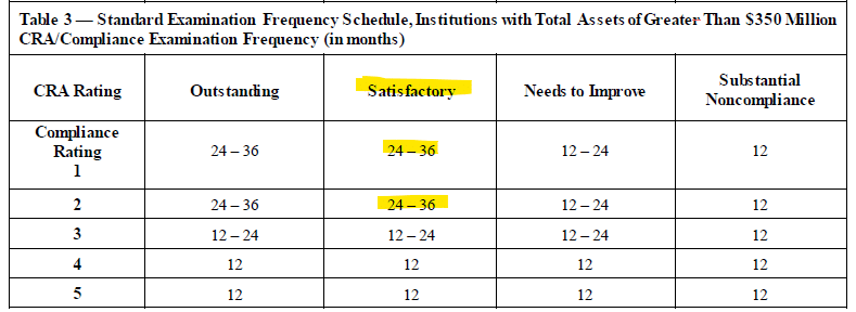 For example, when we compared the cycle for banks in the asset size category greater than $350 million a typical exam cycle pre-November 7, would have been 24 to 36 months if they had satisfactory CRA and Consumer Compliance ratings. Now, with the new schedule, their performance examinations could be as many as 66 months apart.