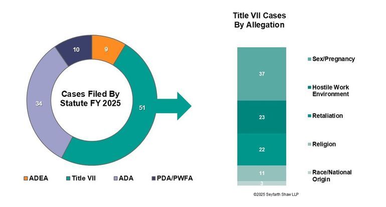 The ADEA is typically the third-most commonly statute cited in EEOC lawsuits, but in FY 2025, the ADEA was overtaken by filings asserting pregnancy-related violations. This fiscal year, the EEOC filed 10 lawsuits under the Pregnancy Discrimination Act and/or the newly-enacted Pregnant Workers’ Fairness Act. When considering claims asserted on the basis of either sex or pregnancy, the EEOC filed a whopping 37 cases alleging such claims. This emphasis on sex and pregnancy-related issues aligns with public statements by Acting Chair Lucas, who has placed an emphasis on enforcing protections in both of these areas.