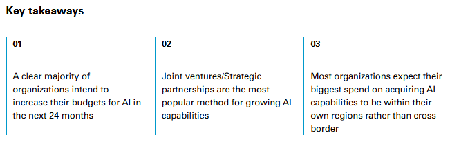 Joint ventures and strategic partnerships top the list of planned expansion models. Some 62 percent of respondents plan to use partnerships in the next two years, and 30 percent cite this as their most important investment route. The logic is pragmatic: Partnerships offer faster access to trained models, specialized tooling and scarce AI talent—while allowing both parties to evaluate technical compatibility, data interoperability and governance fit before making further long-term commitments.