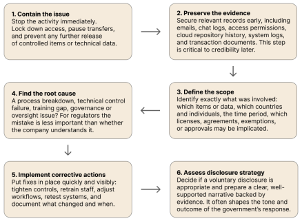 When a potential ITAR issue comes to light, the worst response is to improvise. Regulators expect companies to act quickly, calmly, and in a structured way.