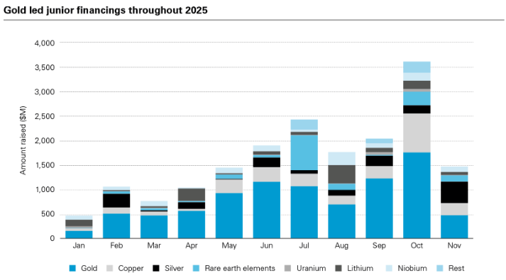 The broadly weak price environment points to consolidation for base metals, expected by 30 percent of our respondents. But miners are prioritizing copper, evidenced by the ongoing Anglo Teck merger. Another 28 percent of respondents expect that gold and precious metals are likeliest to experience consolidation. Instead of low prices and better value for money driving the merger cycle, 2026 may instead see a race for sure bets, inflating copper and gold asset values. Even as investors seek opportunities in critical minerals, junior and intermediate gold miners continue to raise more financing than any other metal, including copper.