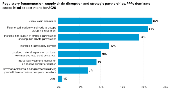 In 2025, geopolitics drove events and investment in the mining & metals sector. The unprecedented degree of uncertainty, led by rapidly changing policies in the US and China, shifted markets into a deal cycle driven by politics instead of prices and supply/demand expectations. Trade flows and prices were similarly affected by pressure to stockpile as much supply as possible in the United States through the summer. The next 12 months promise a consolidation of the sector's ongoing politicization, providing opportunities and risks for miners and investors increasingly reliant on access to policy support across metals markets that are generally well supplied or over-supplied. 64 percent of respondents believe that political variables—mitigating geopolitical risks, securing policy support, or access to critical minerals—are the main priority for 2026.