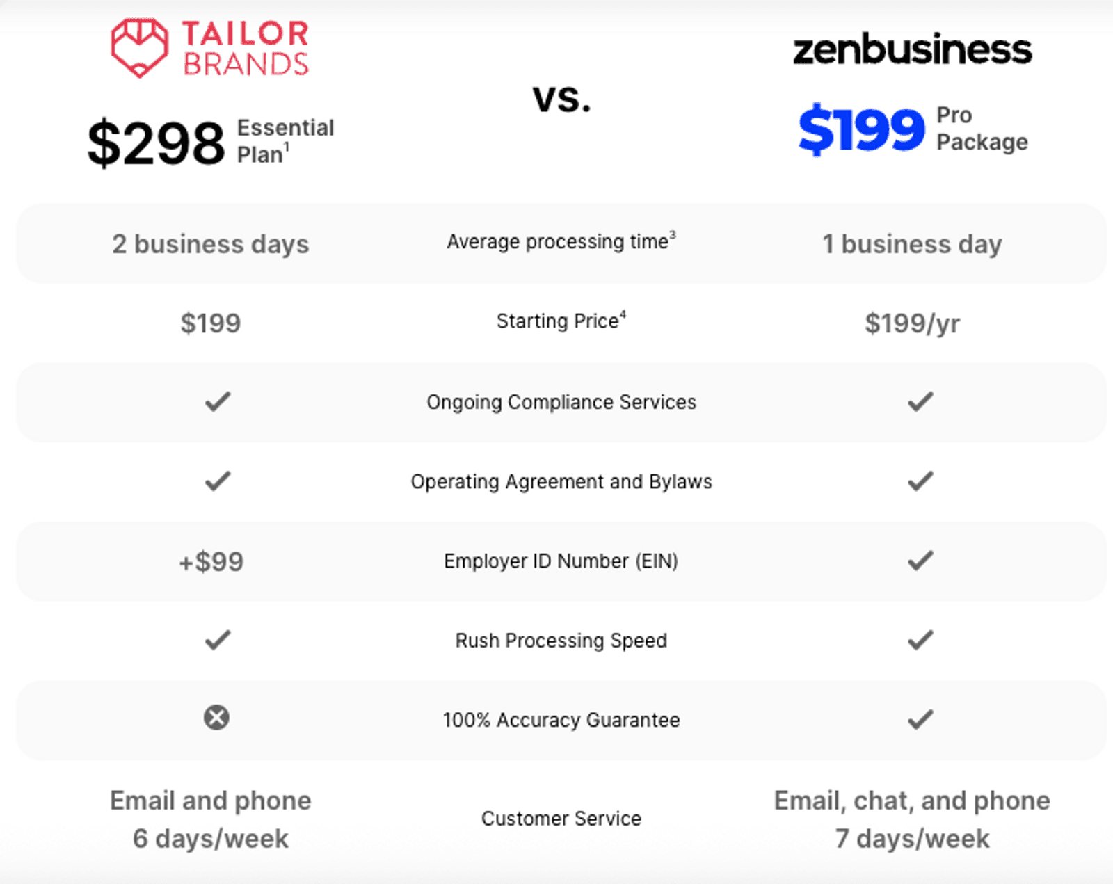 ZenBusiness uses a chart to compare the features it offers to those offered by its competitor Tailor Brands. The eighth row of the chart below reads “100% Accuracy Guarantee.” There’s a check mark under ZenBusiness to indicate that the company offers the guarantee, and there’s an “x” mark under Tailor Brands to suggest the competitor doesn’t offer a similar guarantee.