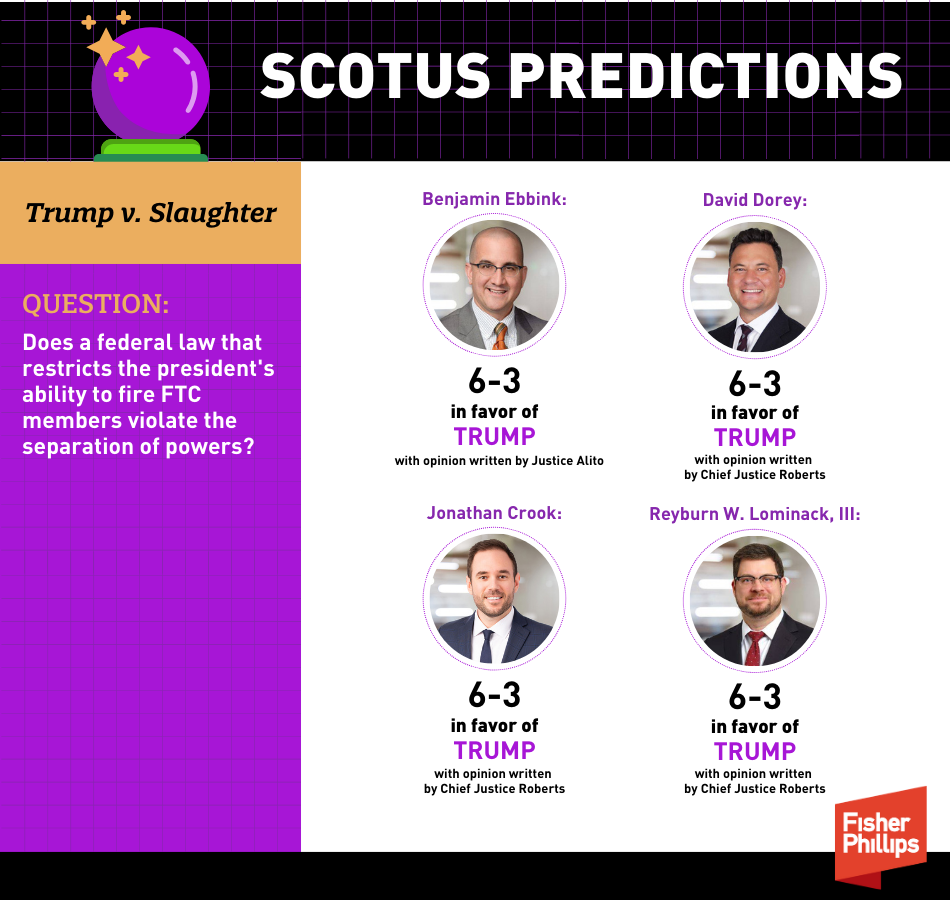 The Supreme Court will likely rule in favor of President Trump in a critical pending case that should be decided in early 2026, vastly expanding the president’s power to remove members of independent agencies. That’s according to the consensus predictions of our firm’s thought leaders monitoring Trump v. Slaughter, a high-stakes case that centers on challenges to statutory removal protections for members of the Federal Trade Commission (FTC). But whatever the court decides could ultimately have sweeping implications for other independent agencies like the Employment Opportunity Commission (EEOC) and the National Labor Relations Board (NLRB) – not to mention the fundamental structure of the federal government itself. Read on for an analysis of the issues, our specific predictions on how SCOTUS will decide the case, and how a final decision in 2026 could impact employers for years to come.