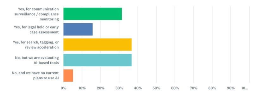 - A smaller but meaningful group applies AI to legal hold and early case assessment;