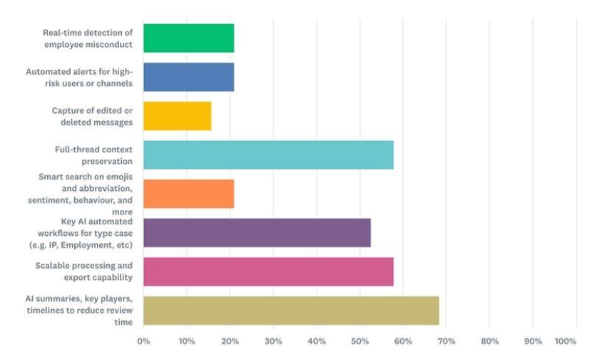 Legal teams should adopt AI as a matter of need. Respondents want smart search, summaries, and scalable exports. Those are the functions that cut review time without cutting corners. They also reflect workflows already in use for surveillance and early case assessment. When AI is tuned to collaboration formats, it becomes a defensibility accelerator.