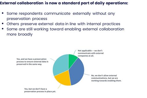 Legal teams should treat external collaboration as first class evidence. Half of respondents either have no external preservation process or are still building one. External channels should inherit internal retention and legal hold logic so that the record stays consistent.