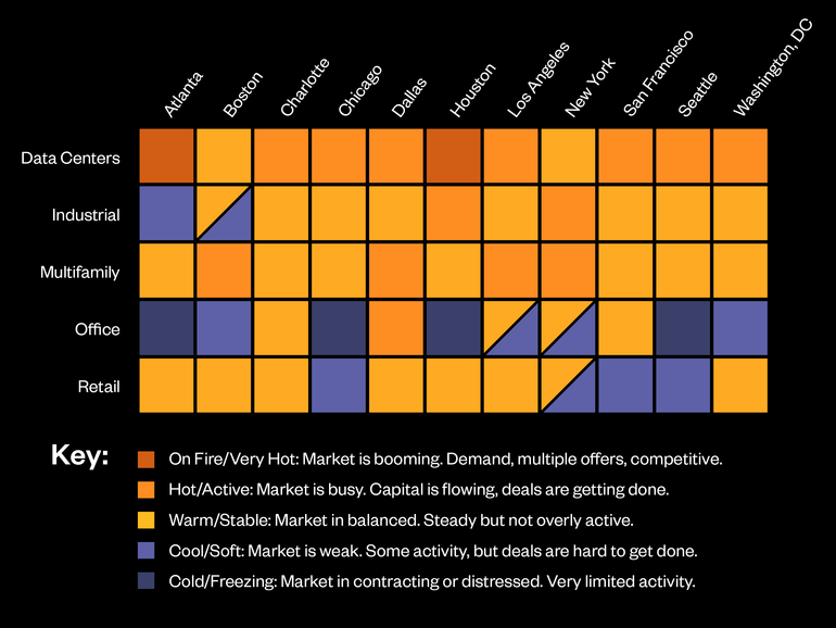 ✔ Opportunities: Data centers are the strongest asset class nationwide, with broad activity in markets from Atlanta to Seattle. Multifamily remains resilient in Boston, Dallas, Los Angeles, and New York, while industrial shows consistent strength, led by Houston and New York.