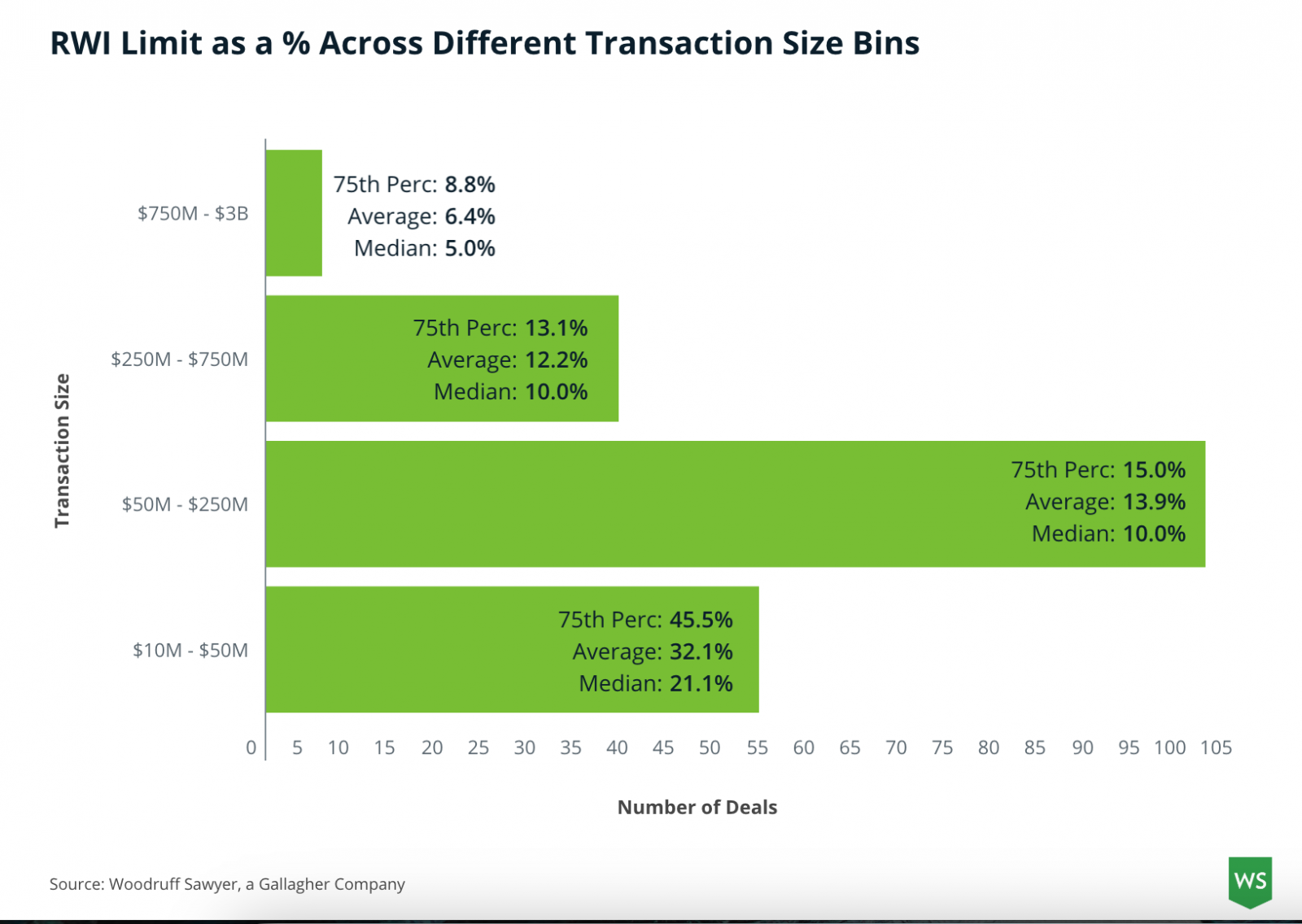 Our team conducted extensive research on reps and warranties insurance claims to further understand limits. Note that for RWI, each policy is bespoke, and breaches often span multiple reps. Add in geographic differences (US vs. Europe) and a wide range of deal sizes being averaged, and it’s clear that claim interpretation is an art, not a science. Specific thanks to Stacey Hammer, Lauren Trapp, and Nallely Rivera for analyzing the data to determine common themes.