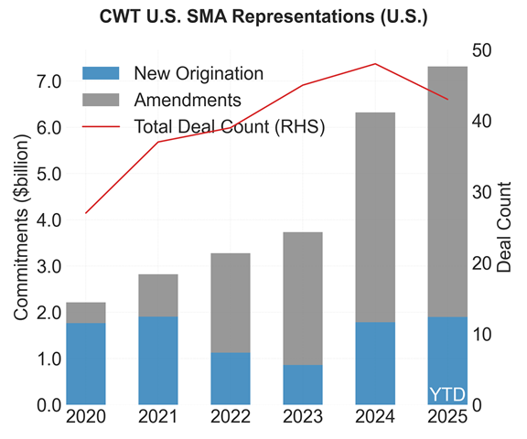 - These facilities have increased in size over time. New SMA facilities average $119 million in revolving commitments in 2025, which is up from around $100 million in 2020–2023.