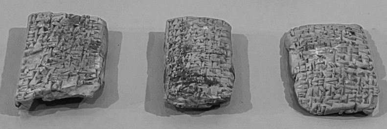I first became interested in ancient loan transactions while visiting the Michael C. Carlos Museum at Emory University in Atlanta, Georgia. On display among their collections are cuneiform tablets from Mesopotamia, including fragments of a cuneiform tablet loan contract for silver, written in front of three witnesses and authenticated by each party by rolled impressions from cylinder seals, circa 1800 BCE, the clay tablet itself measuring about 1 x 1.5 x .5 inches. Figure 1 is a picture of this clay tablet in three pieces, the first and the third constituting the outer envelope and the second the interior document.