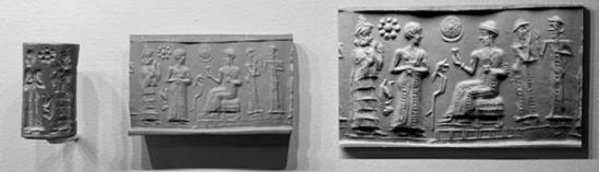 In a nearby gallery is a display of cylinder seals similar to those used on this loan agreement tablet. These seals, reminiscent in size and shape of wine bottle corks, when rolled over clay, created a miniature bas-relief of people, animals, plants and gods, and their activities. Figure 2 is such a cylinder seal (and its impressions in clay and an enlarged photograph) from the Carlos Museum.