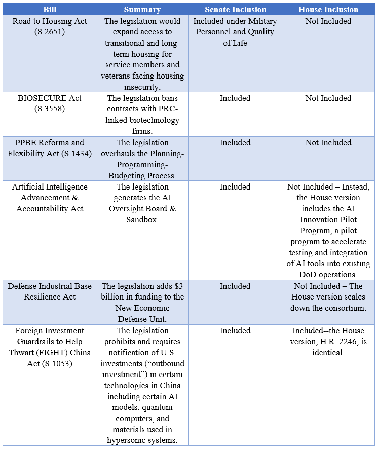 Among the areas of compromise will be the topline authorization number, as the Senate version authorizes $32 billion more. Additionally, key areas of negotiation include differing levels of Ukraine aid, the BIOSECURE Act, AI governance in the Department of Defense and the elimination of DEI and climate policies in the House version.