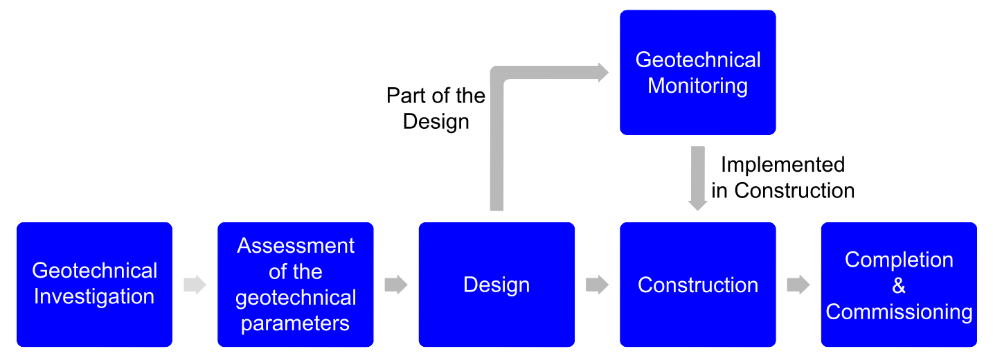 Figure 2: Discrete stages for the construction of a project, and how geotechnical monitoring positively influences those that experience a failure.