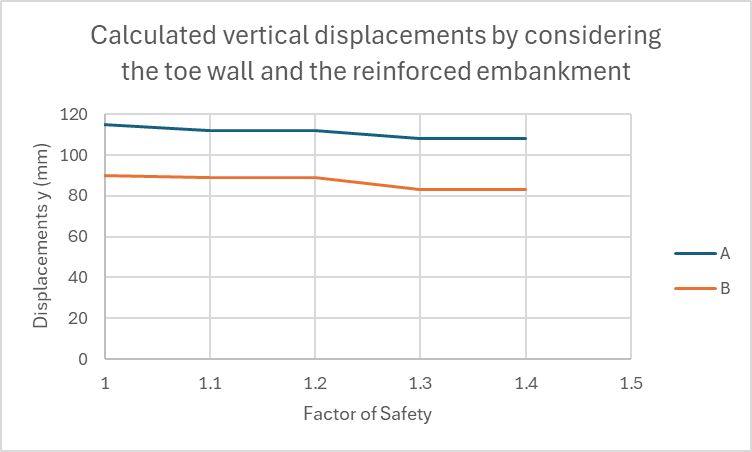 With the model, the calculated displacements were calibrated to the measured values. Through these calibration efforts, the overall stability conditions in the area were re-examined by considering the future tunnel’s bench excavation. Based on the “c, φ Reduction Method” (Gradually Decreasing of the Geotechnical Parameters including cohesion, friction angle, and elastic modulus), the horizontal and vertical calculated, future displacements, for different factors of safety (1.1 to 1.4). This method involves a gradual reduction of the shear strength parameters of the soil mass, until the model reaches the critical failure state. The reduction factor at this point is the factor of safety, as illustrated below: