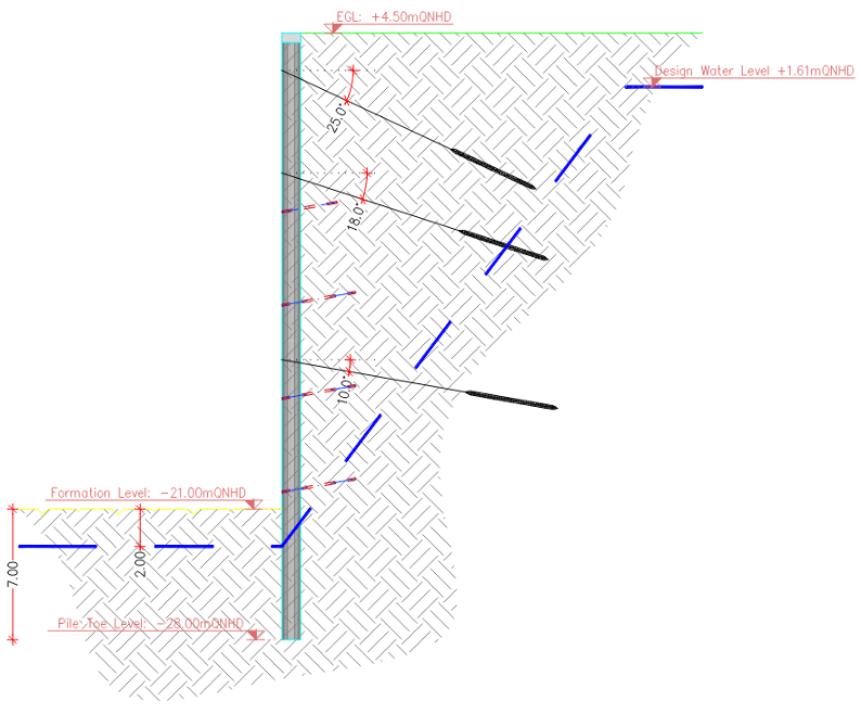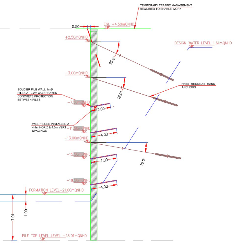 The station’s headwall consisted of contiguous piles with three layers of prestressed anchors that provided lateral support, as illustrated below in Figure 3: