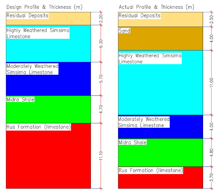 From the above table, it is noted that the sand layer was not anticipated, whilst the thickness of the highly weathered limestone was underestimated.