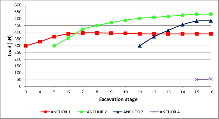 The calculated anchor loads, including the fourth layer installed, following the back analysis (stages 1 to 14), predicted a small increase in load of the third anchor (Anchor 3 above) and a gradual stabilization of the system.