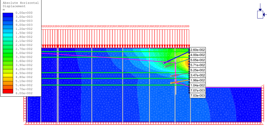 The back analysis calculation was performed in 16 stages, simulating in the first 14 of the as-completed stages, with the remaining two stages to be completed (circa 2.7m). The first 14 stages had been correlated with the available data from the site (excavation stages, depths, anchors installation sequence).