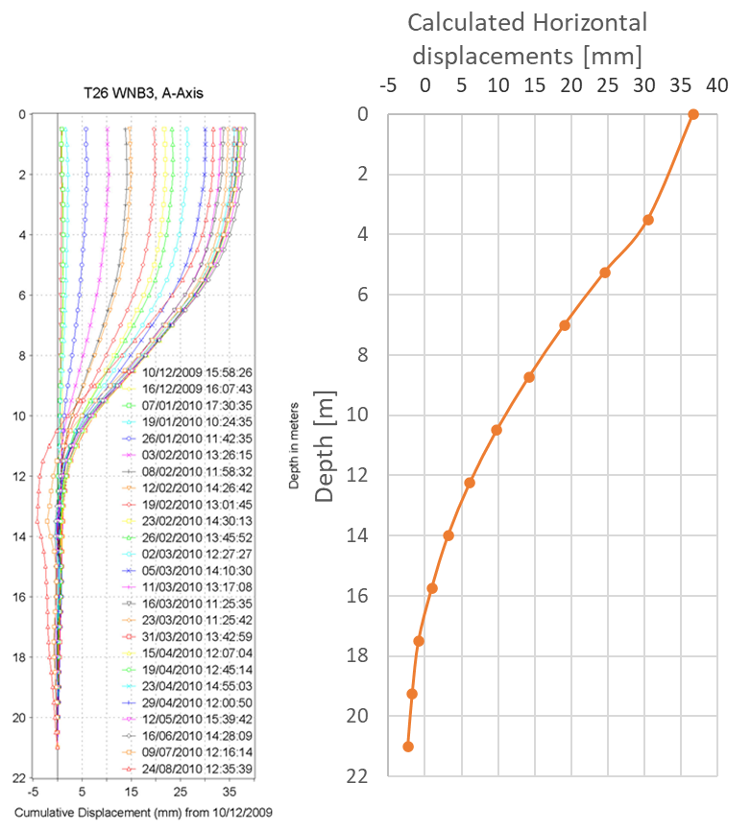 Figure 10: Comparison between measured (left) and calculated (right - forensic investigation) lateral displacements of the slope.