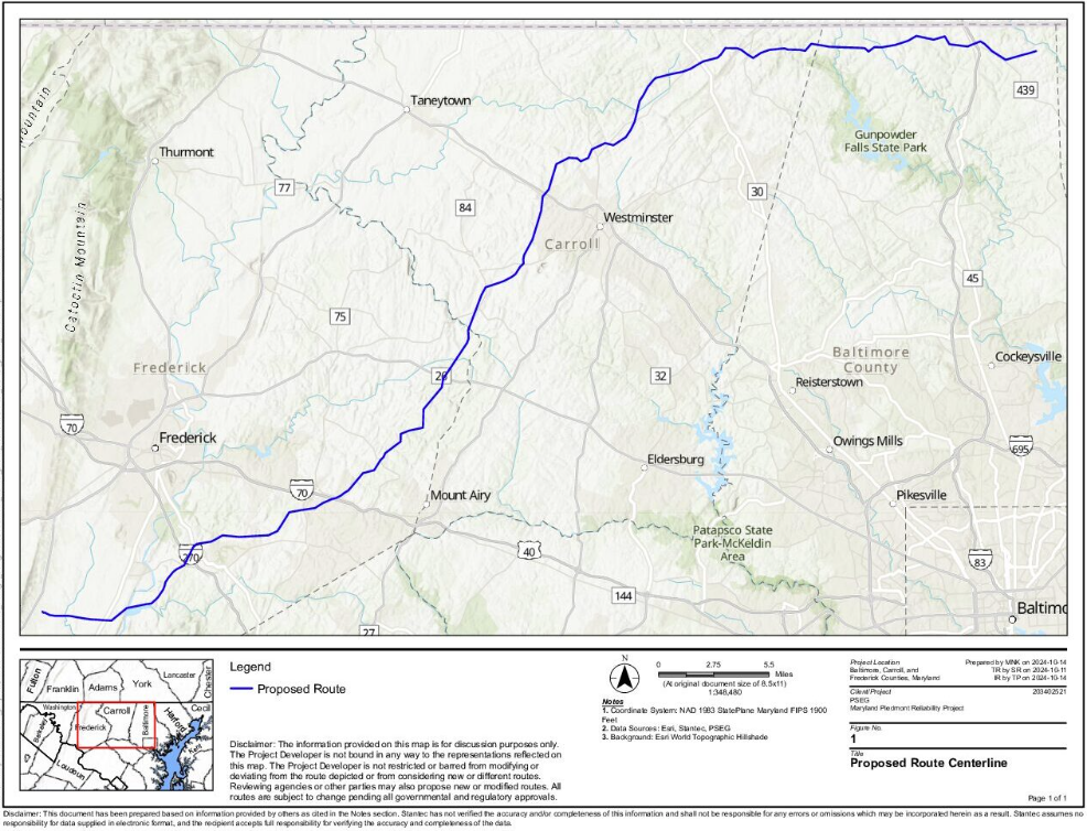 As discussed in the previous article, the Maryland Piedmont Reliability Project is the region’s proposed answer to the diminishing capacity of our electric grid. On October 18, 2024, the Project’s New Jersey-based developer, Public Service Enterprise Group (“PSEG”), announced its preferred route. PSEG will soon present that route, depicted below, to the Maryland Public Service Commission for approval.
