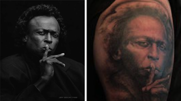 The accused tattoo art appears on the right, and the allegedly infringed photograph on the left: