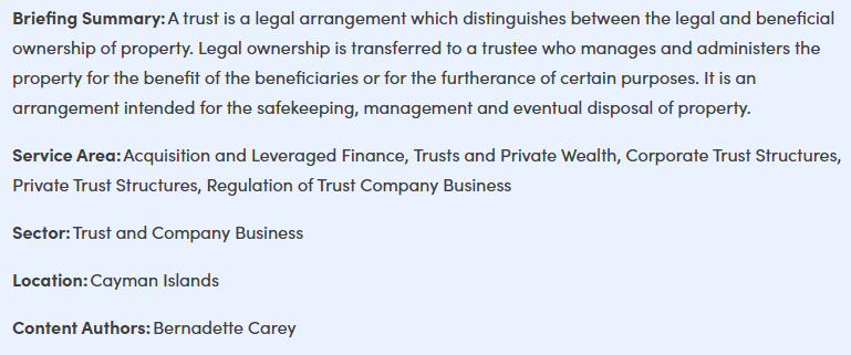 The Cayman Islands is one of the leading jurisdictions for the establishment and management of trusts. It has a sophisticated professional trust sector, modern trusts legislation and an effective judicial system. There is a specialist Financial Services Division of the Grand Court which handles trust matters. Final appeals are to the Judicial Committee of the Privy Council.